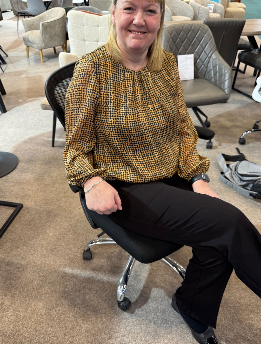 - Black coloured mesh back and fabric seat